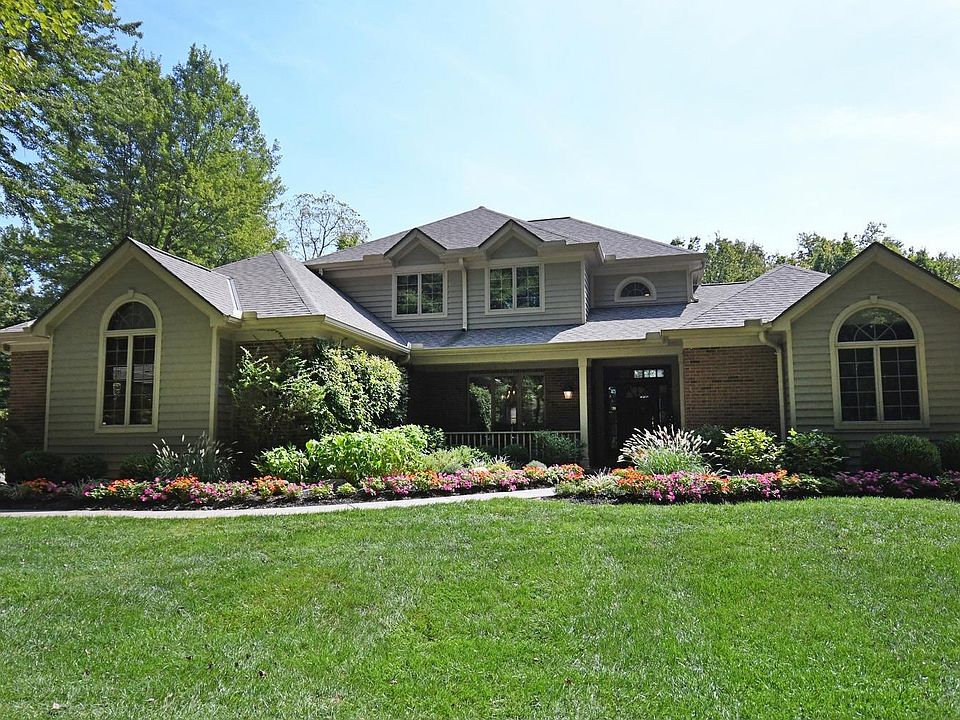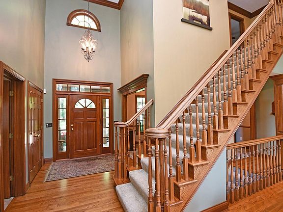 Private setting on 5 acres. This stunning custom home features a soaring two-story stone fireplace in the great room, a 1st floor master suite & laundry, gourmet kitchen with double ovens, granite counters & island. Other amenities include a finished lower level with walkout and guest bedroom/bath and a two-level deck with fire ring and hot tub.