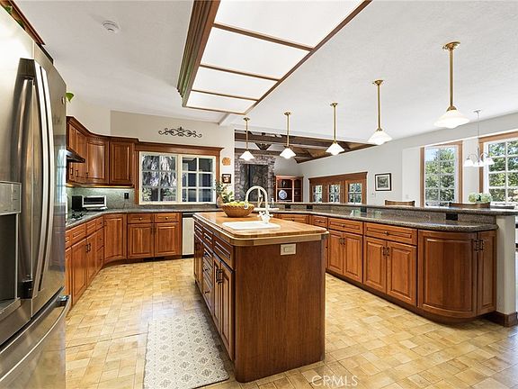 Never before has this incredible home been on the market, lovingly designed and built by the owners with every intention of building an estate that served their family well. This magnificent home is located on over 4 acres of almonds, with a long private driveway, completely fenced which offers privacy, security and a castle to call home! This description won't do the home justice, but look at the photos showing the hand carved staircase and newel posts, the Brazilian hardwood floors with brass inlay, the sold core doors through out, the large rooms offering a welcoming space for all your friends and family. The large media room with 1/2 bath, the huge kitchen with the cabinets built by a craftsman, curving the corners even a concave cabinet in the corner. The living room is a place to pay homage to, with the tall ceilings, the magnificent wood work, the princess balcony, the walls are hand plastered as stucco. There is leaded glass in many windows and doors, there is an ELEVATOR that is oversized getting you from the first floor to the primary suite. Did I mention that the owner had the hand molded brick shipped in from the South? The true SLATE roof, the incredible grounds with fully tiled pool, brick raised garden beds, to many roses to count and a brick porch and patio custom built in a herringbone pattern?