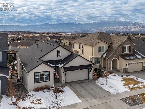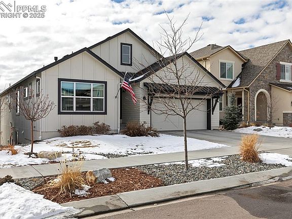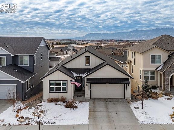 Welcome to this beautiful elegant ranch style home which features many tasteful upgrades you'll truly appreciate. Right from the entry you can see through to the stunning views of Pikes Peak and the front range. Gorgeous genuine hardwood floors flow throughout the main living areas, which feature 9' ceilings, custom light fixtures, custom built-in shelves and cabinets that surround the gas fireplace. The open concept of this home boasts a gourmet kitchen with its center island/breakfast bar, stainless appliances, soft close cabinets, gas stove/oven and separate dining area with views as well. Step out to the large composite deck to soak in the entire view of the neighborhood and mountain range. The main level primary suite features an exquisite bath with double vanity, large walk-in shower, along with a large walk-in closet. Also included on this main level is a secondary bedroom, full bath, and a dedicated office space. The large walk out lower level is complimented by a huge living area, wet bar, game area, large secondary bedroom, another bedroom + ensuite, full bath and lots of storage space. Consider this a truly multi-generational home, if that's what you're looking for. Additional features of this home would include custom upgraded shelving and storage, 220V for future EV charging and custom built-in shelving and workbench in the garage, sorround sound throughout including to the garage, gas plumbed to deck and firepit in the backyard, wired for future security system. Well taken care of and shows like new!!