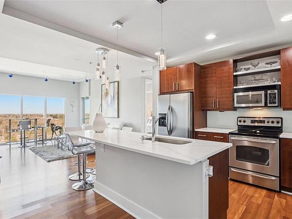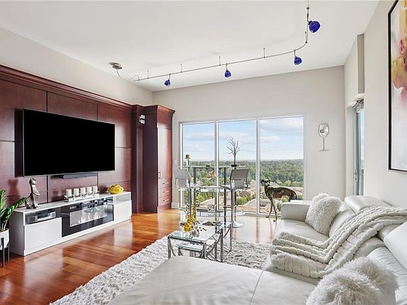 Experience elevated living in this stunning 26th-floor condo, nestled in the prestigious Manhattan high-rise. Offering unparalleled privacy and breathtaking, unobstructed views of Stone Mountain, Kennesaw Mountain, and the vibrant Buckhead community, this end-unit residence is a true gem. Inside, a sun-drenched, open-concept design welcomes you with a seamless flow from the spacious living area to the stylish kitchen. The upgraded culinary space features sleek quartz countertops, a large island with bar seating, custom cabinetry, and a full suite of stainless-steel appliances-perfect for both everyday living and entertaining. A standout custom-built wall unit in the living room adds a touch of sophistication while providing hidden storage for a clutter-free space. The luxurious primary suite offers a serene retreat, complete with a spa-like ensuite bath, dual vanity, frameless glass shower, and a generously sized walk-in closet with custom shelving. A second suite provides a perfect guest room with its own upgraded full bath. Convenience is key with two deeded parking spaces in a gated garage, and the building offers a full range of amenities, including 24-hour concierge service, a fitness center, game room, SkyLounge, tennis courts, and a dog park. Located just moments from Perimeter Mall, Publix, fine dining, and with easy access to major highways and Marta, this condo offers the ultimate in luxury living and convenience.
