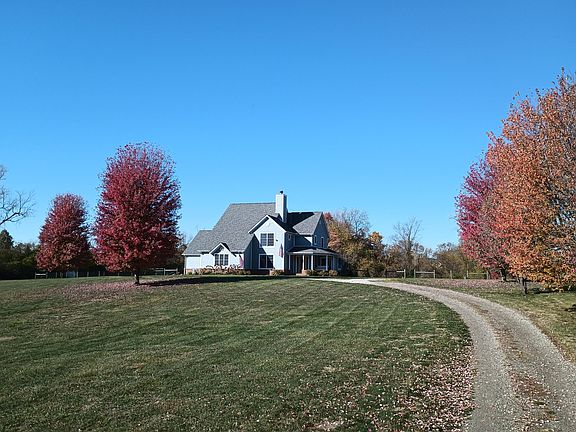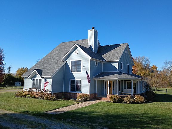 Curb appeal on a secluded 5 acre setting w/country views! Spacious custom 3,299 s.f. home featuring an open floor plan! Cook's kitchen w/plentiful cabinetry, island w/breakfast bar & built-in desk. Hardwood floors in the parlor with fireplace and the dining area which opens to the living room & inviting four season sunroom featuring walls of windows overlooking the huge fenced backyard ringed by mature trees! First floor primary suite w/dual closets + walk-in closet & walk-in shower! Second floor features 4 bedrooms, 2 full baths plus a huge bonus room & den/office! Partially finished lower level provides theater room & rec room areas w/egress window! Main floor laundry w/cabinets & sink. Security system. Lemonade in the shade on your covered front porch swing. Welcome home!