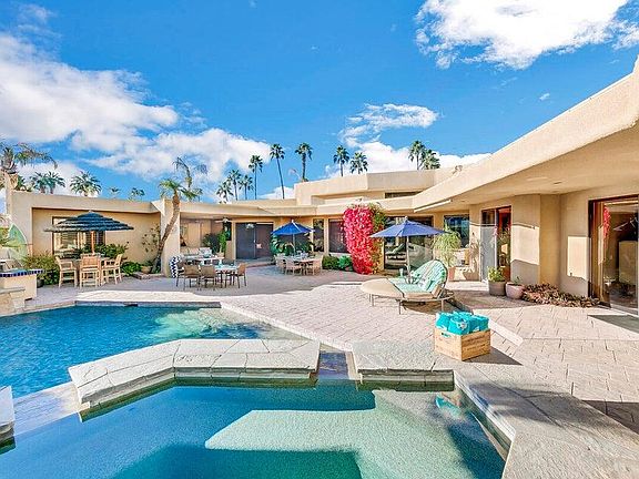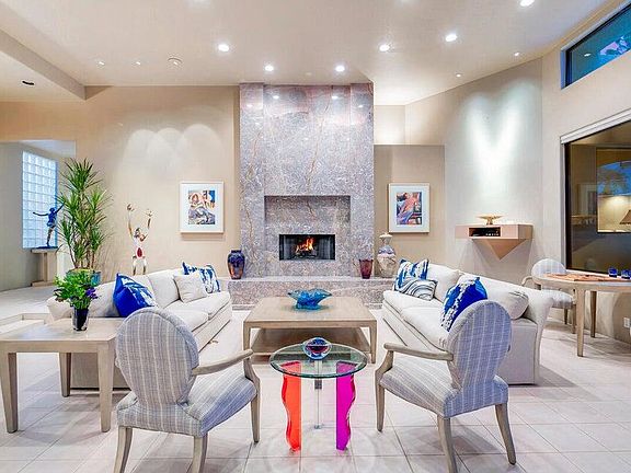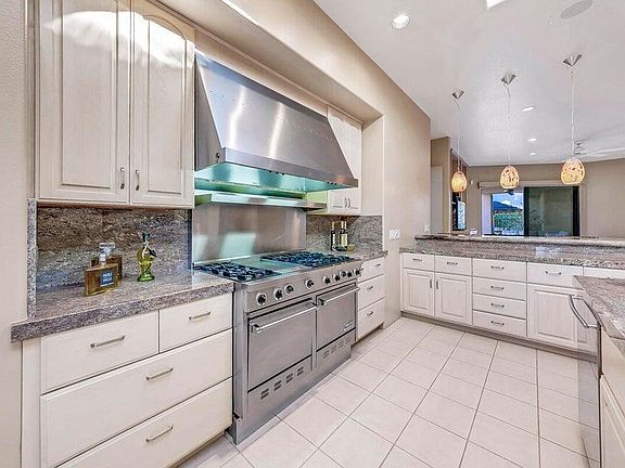 Experience the pinnacle of luxurious and eco-conscious living in this stunning 4-bedroom, 5-bathroom home, powered by a state-of-the-art solar lease through SunPower. Spanning 5,007 sq ft of living space, this home offers the perfect balance of elegance and environmental responsibility. Set on a sprawling 16,117 sq ft lot, the property features a tranquil pool and spa area, complete with breathtaking mountain views. Inside, the home boasts a seamless flow with beautiful and practical tile floors throughout. Two fireplaces create a cozy and inviting atmosphere, ideal for spending quality time with loved ones. The heart of the home is the gourmet kitchen, a chef's dream with a skylight providing natural light, elegant stone countertops, and premium Viking appliances. Entertain in style in the formal dining area, complete with a sunken bar adorned with exquisite Brazilian bluestone. Custom lighting throughout adds a touch of sophistication and warmth. The property includes a 3-car garage plus a dedicated golf cart garage, offering ample storage for your vehicles and recreational equipment. Relish the luxury of privacy with no neighbors on either side, allowing you to enjoy the peaceful tranquility of your surroundings. This home embodies sustainable luxury living, providing an idyllic retreat for you and your family. Your dream home awaits! Schedule a showing today to witness this breathtaking property and embrace a lifestyle of luxury and sustainability.