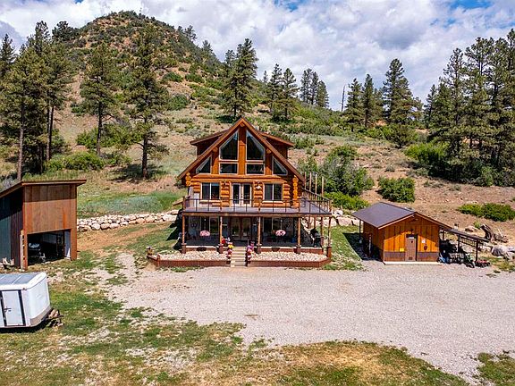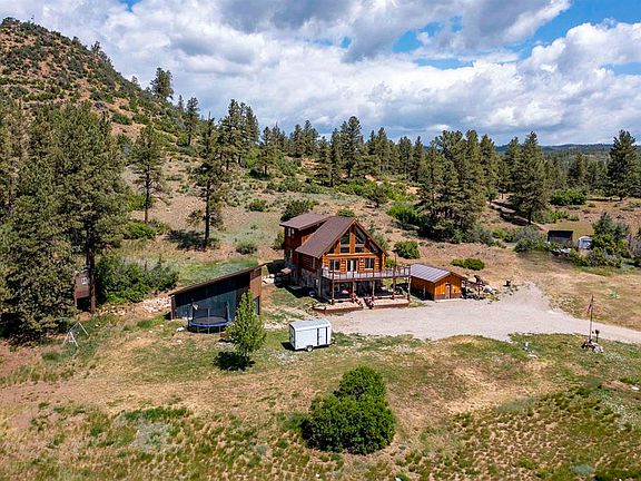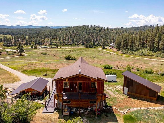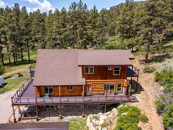 This beautiful 3669 square foot log home sits on 35 acres with open mountain views and tall pine trees. You will enjoy all the amenities of country living while just 3 miles from downtown Bayfield. Not only would this 3 level home make a great residence, but would also make a good short or long term rental. It could potentially be rented as 2 separate living units as it does have outside access to the second level pending the county ADU process. The Bottom level has a concrete covered patio, kitchen, walk-in pantry, laundry room, mud room, living room, bathroom and 2 bedrooms. The second level has a huge nice deck to enjoy the morning sun, 2 bedrooms, a bathroom, a walk-in pantry, an extra area with an outside access to the deck and a large living area that is currently being used as an entertainment/game room. The plan for this room is to install a kitchen and is already plumbed for one. Plans for this kitchen are drawn up and available if requested. The 3rd level is where you will find the primary bedroom, bathroom, dressing room and walk-in closet. This spacious bedroom has an extra area for computer set up, exercise equipment or just a relaxation area. There is a door that leads to your own private back deck that faces the mountain. The bathroom has a jetted jacuzzi tub and a walk-in tile shower with 2 separate shower heads and 2 sinks. This beautiful home has many outside amenities that make country living at its best. Located just to the north east of the house you will find an insulated chicken coop with electricity, a shed, an area for a garden if you want one and a perfect spot for orchard trees. To the east you will find a 100 yard shooting range with a cemented stand and off to the west a 300 yard shooting range. There is also plenty of activities for the kids. They will enjoy the trampoline, a zip line and an insulated tree house that has electricity and comes with a TV. There is currently a 1 stall garage, but is equipped for 3 stalls. Located by the house is a nice new 14 x 20 wood/metal sided shed with electricity and lights for lawn equipment, recreational vehicles' or whatever you wish to store. There is also an RV hookup by the front of the house. This home has much to offer and has the privacy of the country, but only minutes away from Bayfield. Come check it out! Seller is Motivated!