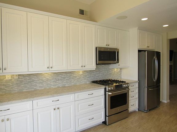 Absolutely adorable single story 2 bedroom + den, 2 bath home in Tamarack Point, Carlsbad. 1350 Sq ft. 2 car attached garage. Remodeled kitchen with granite, stainless steel appliances, gas stove, pull out drawers, self closing drawers and darling breakfast nook. House sits high up on street with awesome southwesterly views! Shutters and Hunter Douglas blinds, vaulted ceilings, fireplace, ceiling fans, 3rd bedroom converted to office, pull down storage in garage. Home comes with a spa (not warrantied), refrigerator, washer and dryer (not warrantied). Gardener and spa guy included. Community tennis courts, basketball court, picnic area, and tot lot just down the street. No pets.