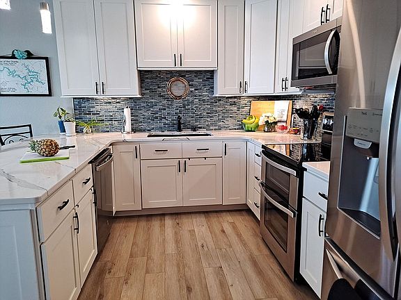 Looking for an expansive view in Mill Creek Cove and easy access to the deep-water dock? This completely updated 1800sf home features 4 BR (2 king size w ensuites), queen Murphy bed in 4th, 3.5 BA, gas fireplace, and oversized insulated 2-car garage. The screened lanai that spans the length of the house and roomy swim platform are great for outdoor entertaining. New roof in 2020, new waterproof LVP flooring throughout, updated baths, new kitchen w Cambria quartz counters, quartz sink, stainless appliances, including double oven range. Bedrooms and 3 baths on upper; kitchen/dining/family room, utility and ½ bath on lower w 9.5’ ceilings and a wall of windows. The concrete dock is 18x32 w 10x30 slip and 8000# hoist, 12x22 swim, and dual PWC platform lift. Most furnishings optional. Boat also available for extra $$. This one is move-in ready for your summertime fun! (NO nightly rentals.) Buyer’s agent welcome (comm. negotiable). Email Silvermoon16741@gmail.com to schedule showing.