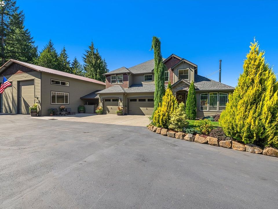 Experience elevated living in this entertainer's retreat, rooted in the spirit of the Pacific Northwest. Surrounded by trails, lush landscaping, and sweeping views, this Garrette Custom Home is designed for gathering and built for living! Inside, tall ceilings, detailed millwork, and thoughtful finishes create spaces that feel refined and welcoming. As you enter, the wood stove creates a cozy ambiance to keep you warm all winter long. The chef’s kitchen is designed for gathering, featuring knotty cabinetry, granite tile counters, double ovens, gas range, coffee bar, and a walk-in butlers pantry. The main floor primary suite offers a soaking tub, dual shower heads, and a custom walk-in closet with private laundry. A large bonus room or 5th bedroom adds flexibility, perfect for movie nights, play, or a home studio. From summer evenings to hobbies and hosting, the outdoors has it all! A 24x14 covered outdoor kitchen featuring grills, sink, built-in storage, and mounted TV, for a versatile outdoor retreat. An oversized deck with retractable awning, covered hot tub, fire pit area, secret garden pathway, and a full playground create spaces to enjoy year-round. Cherry and apple trees, manicured landscaping with full irrigation, and surrounding arborvitae give privacy for a serene setting. The 38x48 shop provides versatility, offering oversized RV/boat doors, loft storage, built-in racks, electricity, and a private office. Covered RV parking, wood storage, and built-ins ensure everything has its place. Additional upgrades include a whole-home fire suppression & sprinkler system, generator hookup, well w/water softener & iron filtration. A secure gated entry provides an estate-like feel. Here, you’re never far from what makes the NW special with miles of equestrian and ATV trails, the Banks-Vernonia Trail, local markets, and the quiet charm of small-town living, all within easy reach of the city and Nike and Intel. Luxury, leisure, and lifestyle all in one place.