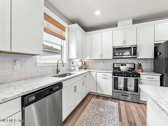Don't wait for new construction, this stunning 4 bedroom home is MOVE-IN READY! This home is Pulte's Spruce plan in Bradley Pond, a natural gas community with a kayak launch and NO CDD FEES. Full of upgrades, you'll enter this home & see an open concept floor plan with 9' ceilings. This home features 8' doors, quartz countertops, soft close cabinets, upgraded lighting & fans and luxury vinyl plank flooring in the main areas. The gorgeous kitchen has stainless steel appliances including a gas range, tile backsplash, 42'' cabinets with crown molding, large drawer stacks, waste basket pull out & double roll out trays and a single undermount sink. Upgraded gold light fixtures, sink faucet and cabinet pulls have also been added. Living room has a beautiful fireplace with a mantle. Primary bedroom has a walk-in closet and bathroom with a frameless glass walk-in shower. All bathrooms have been upgraded with comfort height elongated toilets. Gas tankless hot water heater and dryer hookup is set up for electric or gas. Spacious covered lanai is accessed from a triple sliding glass door and has a gas stub perfect for grilling! Backyard includes a private & peaceful view of the trees and is fully fenced. Great location near I-295 for commuting, River City Marketplace & minutes from a new Publix. Don't miss out on this amazing home!