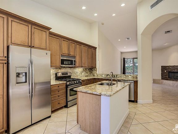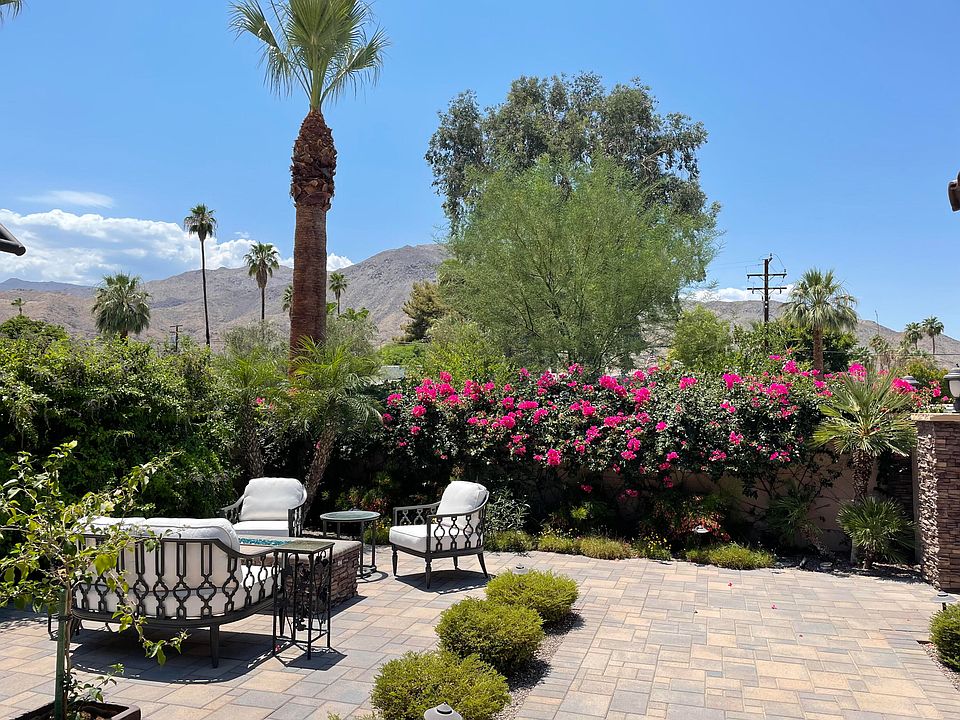 Do not hesitate on this rare opportunity to own this romantic Spanish-Mediterranean 4 bedroom, 3 bathroom with rare 3-car garage, in prime location close to El Paseo shops and restaurants! Built in 2007, this stunning home offers elevated ceilings & doors, astacked-stone gas fireplace in the living room, and a see through fireplace in your primary bedroom/bath! The kitchen/dining area has beautiful granite slab countertops intermingled with stainless steel appliances and a large walk-in pantry. The current owners thought of everything, even adding a whole house water purification system, new AC, AND paid for solar! The 4bedrooms are thoughtfully separated for privacy, creating an excellent work from home environment. A near $200,000 renovation was completed on this home to creating a stunning gated, Spanish courtyard with eat-out dining room and quaint French-doors, morning coffee/grill space andseparate firepit area. From the courtyard, which faces southwest, you have lovelymountain views and, at night, you will see the lighting of the Palm Desert Cross! This home has a very secret-garden feel with lush and mature landscape that also include pomegranate, lime, lemon, tangerine, redgrapefruit, orange, and passion fruit. Your guests will enter the compoun
