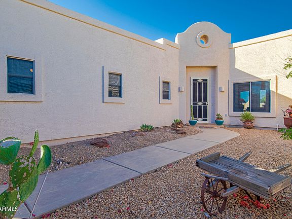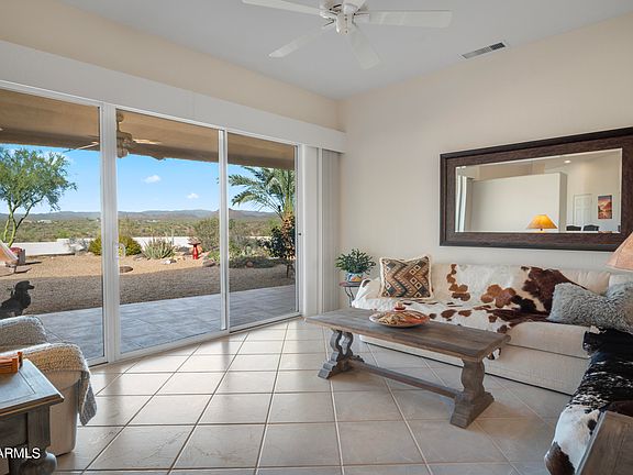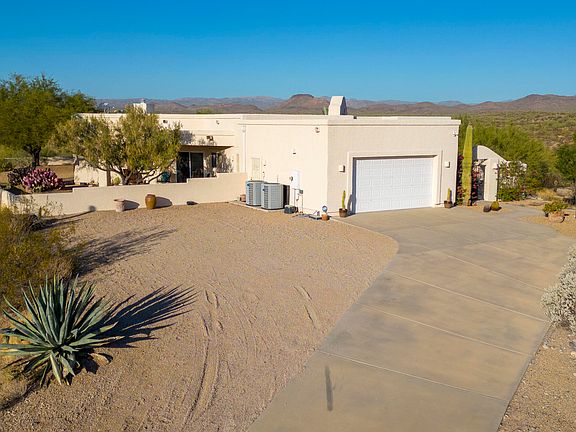 You really can have it all. This stunning entertainers dream is a 2,323 sq.ft. territorial home offering breathtaking 360 degree views, and is designed to bring the outside in with numerous covered patios and exits. Impeccably maintained, it features 3 bedrooms, 2.5 baths, a formal living room, dining room, and separate family room with a cozy fireplace. The eat-in kitchen is equipped with granite countertops, custom cabinets, and ample storage space. The primary bathroom boasts a glass tile shower and a spacious closet. Outside, relax in the private courtyards, hot tub, and fireplace, while the detached RV garage provides ample storage for all of your toys or can double as tack/feed storage. With 4+Acres you have lots of room for whatever your heart desires. Enjoy privacy and serenity, just 15 minutes from Wickenburg, the Roping Capital of Arizona, and 25 minutes from Surprise for all your shopping needs. And, the icing on the cake is your private well with a 1,500 gallon storage tank.
