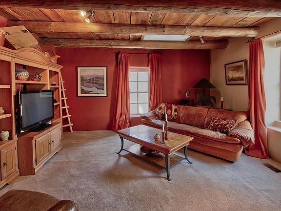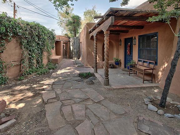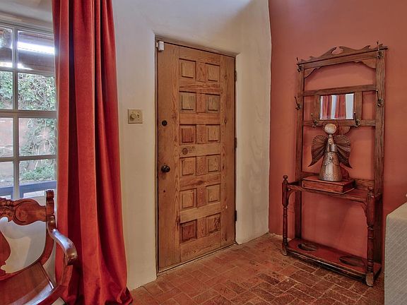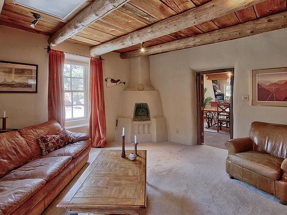 Enter this historic adobe compound in the heart of Corrales village and feel the tranquil charm of another era. Handhewn vigas, 5 fireplaces,talavera tile, brick floors,4 bedrooms and a spacious Sala Grande make the main house memorable. Master suite surprises you with mountain views and overlooks a lush, quiet courtyard with huge trees, green grass and 3 fountains. Property also includes 980 sf office, formerly used as a casita, with kitchen and 3/4 bath. Now zoned A-1. Could be commercial.