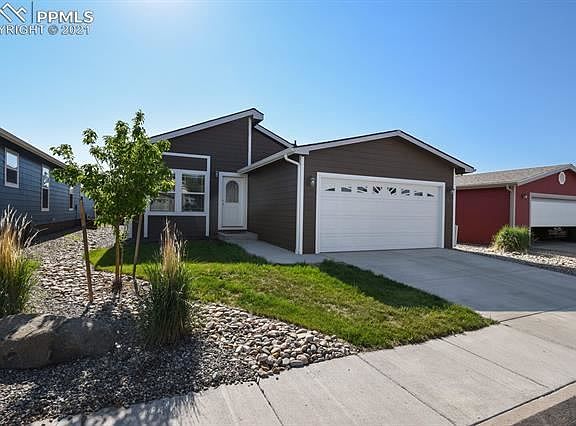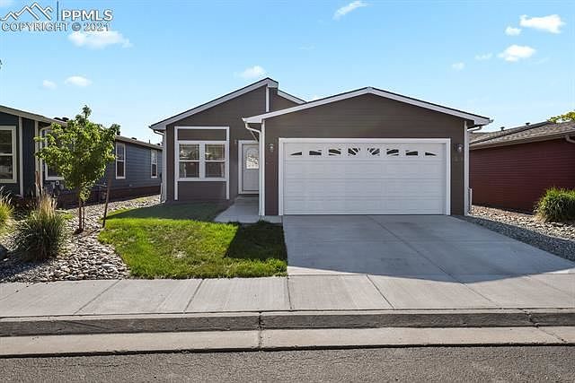 You've always been curious about the houses here, and now is a perfect time to come and explore a great opportunity at the Chateau at Antelope Ridge! Built in 2018, this adorable 3 bedroom, 2 bath, 2 car garage ranch home offers main level living and the classy interior updates that you have been searching for. You'll love the luxury vinyl plank flooring upgrade, and the spacious feel provided by the high ceilings. The cozy living room opens up to a beautiful kitchen, complete with rich truffle cabinets, a stainless steel Whirpool Suite of appliances (including hood vent), a farmhouse apron sink, and a gorgeous kitchen table that doubles as extra counter space (table and chairs stay!) The door off the kitchen leads you to the quaint patio/side yard to enjoy your morning coffee or BBQ's in the summer. The laundry room is conveniently located off the garage entrance. There is a small bedroom off the living room that's currently being utilized as an office space, and down the hallway there is the main bathroom, another secondary bedroom, and the master bedroom with attached bathroom. The community offers many amenities to its homeowners; a clubhouse with meeting room, media center, lending library, exercise room, heated pool and toddler pool (open Memorial Day to Labor Day). Conveniently located between the Powers and Marksheffel corridors, with easy access to several military bases as well as shopping, dining, the airport, entertainment and more. Come fall in love with this house, and begin the process of making it the place you call home! Schedule an appointment today.