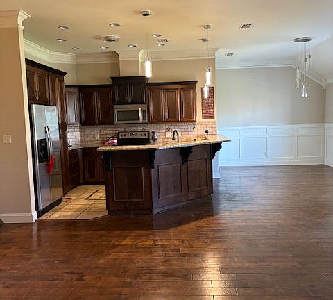 Discover all the comforts of home in this stunning country-style residence, featuring 4 spacious bedrooms and 2 beautifully appointed bathrooms. From the moment you arrive, you're welcomed by a striking stone-accented entryway that leads into a grand living room with gleaming hardwood floors and remarkable vaulted ceilings. A custom-built entertainment center frames the elegant stone fireplace, creating a warm and inviting focal point that truly sets this home apart. The kitchen is a chef's dream, boasting custom cabinetry, sleek stainless-steel appliances, and convenient drawer shelving for expanded storage. A built-in breakfast bar seamlessly connects the kitchen to both the dining and living areas, perfect for everyday living and entertaining. Overhead, stunning pendant LED lighting adds a modern touch, while the intricate tilework underfoot enhances the kitchen's craftsmanship and charm. The master suite is a private retreat, highlighted by a breathtaking vaulted ceiling and a luxurious en suite bathroom. Relax in the spa-like space featuring a double sink vanity, a large walk-in shower adorned with elegant tile, and a jacuzzi tub perfect for unwinding at the end of the day. This exceptional home offers a unique blend of comfort, design, and detail you won't find anywhere else. It's a must-see and won't stay on the market for longschedule your tour today Property Features: Size: 1,972 sq ft of living space Bedrooms: 4 generously sized bedrooms with ample closet space Bathrooms: 2 full bathrooms with updated fixtures and finishes Garage: Attached 2-car garage with a wide driveway for extra parking Yard: Massive, fully fenced backyard ideal for outdoor play, or entertaining Living Areas: Open floor plan with spacious living and dining rooms flooded with natural light Kitchen: Modern kitchen with plenty of cabinets, quality appliances, and functional layout Outdoor Living: Covered back patio overlooking a lush lawn and mature trees Privacy: Situated on a large lot with privacy fencing and no rear neighbors in view Location: Nestled in a peaceful neighborhood with easy access to top schools, parks, and local amenities Utilities & Resident Services: Online portal for rent payments and maintenance requests Minimum renters' insurance required: $300,000 liability coverage