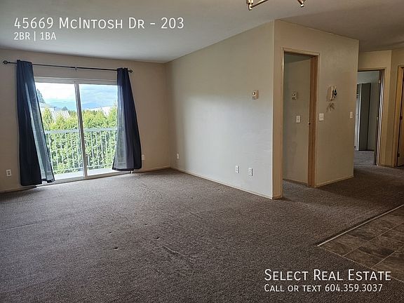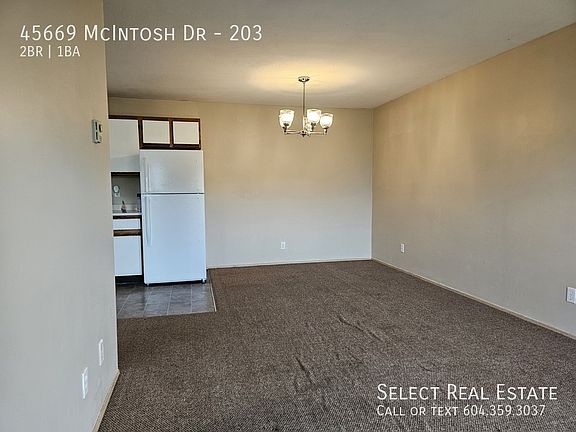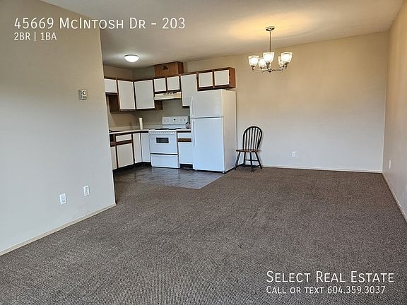 Address: 45669 McIntosh - 203 Date Available: May 1, 2025 Description Awesome condo in a quiet and desirable complex with a great strata. This two bedroom with in-suite laundry is located in the rear and secluded side of the building facing privacy hedges. Very spacious layout with one designated parking spot, plus plenty of visitor parking. Lease Details Lease duration: 1 Year Deposit: Months Rent. Pet Deposit: N/A No Smoking Property Details Bed: 2 Bath: 1 SQFT: 750 Pet Details Pets(Yes/No): No Type Allowed: N/A Number: N/A Size Restriction: N/A Exterior Details BBQs allowed(yes/no): No Parking type and how many: 1 spot allocated Yard Usage: NA Yard fully fenced: NA Shed Or Shop Usage: No Appliances Included Fridge: Yes Range: Yes Dishwasher: No Microwave: No Washer/Dryer: Yes Shared Laundry: No Pay Laundry: No Fireplace: No Air conditioner: No Standalone freezer: No Utilities Gas: N/A Hydro: 100% tenant Internet/Cable: 100% Tenant Water, Sewer, Garbage: N/A Utility Type Heat Source: Baseboard heating Septic/Sewer: Sewer Water Source: City Tenant Responsible for Septic pumping: No