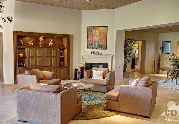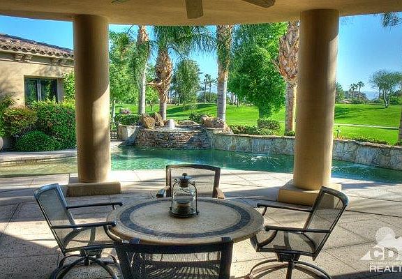 Magnificent semi-custom home with spectacular mountain views. Located on the 6th fairway in the prestigious Villaggio community at Indian Wells CC. This elegant home features 4 br, 4.5 ba and over 3700 square feet of living space and is offered with designer furnishings and a golf membership. A grand courtyard with bubbling fountain leads you into the great room with high wood grained ceilings and walls of glass that open to amazing fairway and mountain views. The huge chefs kitchen features high-end appliances, granite counters, custom cabinets, a butler's pantry and a breakfast nook. The spacious master bedroom suite has French Doors that lead to the back patio and the master bath offers an over-sized walk in shower, soaking jet tub, walk-in closets and large open vanity areas. The outside entertaining area features a pebble tec pool and spa with rock water features, a huge covered patio with fans, heat lamps, TV and a fireplace plus a separate covered dining area with a BBQ cook center.