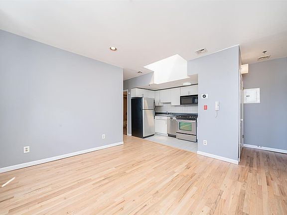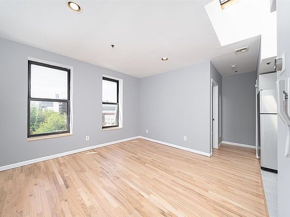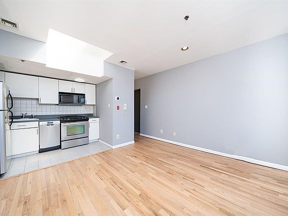 Welcome to this bright and airy 1-bedroom, 1-bath condo located on the top floor of a well-maintained walk-up building in the heart of Hoboken. With 508 sq ft of living space, the unit features hardwood floors, a modern bathroom, and southern exposure windows plus a skylight that floods the home with natural light. The kitchen is equipped with a stovetop with oven, microwave, refrigerator, and dishwasher. Washer/dryer available in the building. The unit also includes forced air heating and central A/C for year-round comfort. The building has a secured, locked entrance for added peace of mind. Convenient, walkable location just minutes from the PATH train, parks, bars, restaurants, shopping, and the community center. Please note: Photos include digitally added furniture for staging purposes. Utilities Included: Water, sewer, and trash Tenant Pays: Gas, electric, and internet Parking: Not included Furnishings: Unfurnished Building Type: Walk-up (4th floor, no elevator) HVAC: Forced air heat & central air conditioning