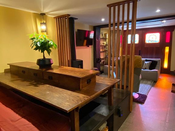 Im looking for an exceptional renter! This Japanese style, garden level unit is around 750 sq.ft. It has off street parking with guest parking space. The two unit house is a corner lot with Mountain View's located downtown and walkable in 10 minutes downhill to Pack Pack, restaurants and entertainment. There is a lovely Japanese garden to share with upstairs tenant. This unit is Fully Furnished as 1 bedroom and one bath with luxury amenities such as heated floors in bathroom, heated towel bar, heated bidet, a 2 person dry, full spectrum sauna and 6ft soaking tub. The kitchen has a two burner gas cooktop, a German counter top stove and steamer. The living area has a 15,000 btu gas fireplace and 32" TV with headphones for late night movie viewing. The bedroom/workspace has a comfortable queen size Murphy bed cabinet that can be put away for stretching, meditation or working space along with a small closet. There is a compact Bosche washer and dryer are located in owners closet between bedroom and bathroom. The front double doors are are stained glass above with colored side panel to let lots of light into the lower level unit. The bathroom & bedroom and living has two windows, the kitchen has one window. Its cozy! A great lower level and sunny apartment to weather the winter months. $1700 per month lease plus half the utilities with the upstairs unit. Asking for at least two month commitment. Looking for the best fit with couple upstairs. Its better for one person or a quiet couple. Look forward to hearing from you. Ellis -3 December through 28 February -$1700 per month plus half the utilities w- upstairs apartment -beautifully appointed furnished space for 1 person or loving couple