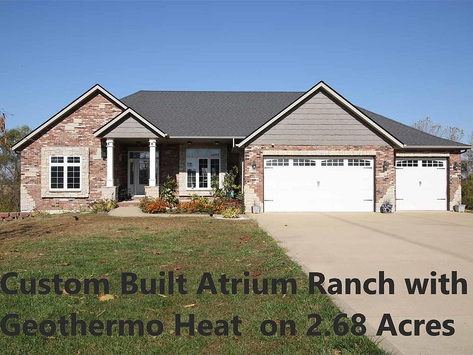 Quality Well appointed Custom Home in Triad School Dist. ATRIUM RANCH with Finished Walk Out Lower Level. 3 car att'd Garage. 3 Bedrooms, 3 Baths, Great Room and Huge Family/Rec Room in Walk out Lower level with Fireplace. Spacious Master Bedroom, tray ceilings, bay window, walk in closet and spacious luxury master bath. SPLIT BEDROOM PLAN. Main Floor Laundry. GEO THERMO HEAT, 9 ft basement, room to grow in lower level. PRIVATE TREE LINED BACK YARD, backs up to farm ground. Note: Above Ground pool has been removed, deck remains.