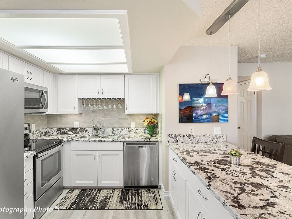 Immaculate and absolutely gorgeous, this stunning REMODELED & FURNISHED Rock Springs condo is a must see! Tucked away off of the main thorough fair, this gem hosts the perfect location. Neutral paint, clean window treatments, fresh base trim & custom ceiling fans are so appreciated. Gorgeous luxury vinyl and upgraded carpet cover the floors. Unique granite, custom new white cabinetry, pendant lighting, modern subway tiled backsplash, all new appliances, R/O, updated hardware and new faucet accent the kitchen. A spacious eating bar w/ pendant lighting separates the open plan kitchen from great room. A bay window surrounds the dining area and lets in awesome natural light. The great room is very spacious. New Mocha cabinetry in both bathrooms offer a spa like feel. The bedrooms are generously sized with large closets and the owner's bedroom hosts its own ensuite. A convenient laundry area is located inside the unit and washer & dryer are included. The front patio space hosts a Mountain view. The grounds are beautiful, well maintained and the pools & spas are a bonus.