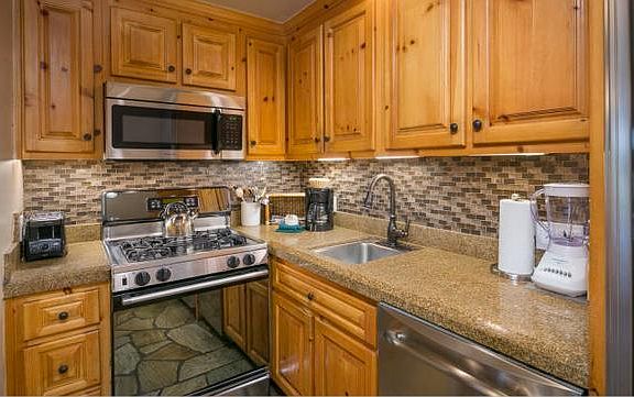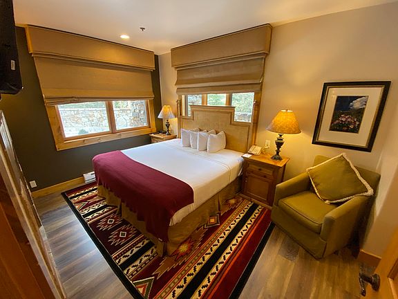 Comfortable and quiet two bedroom corner unit at the Mountain Lodge that offers unique and private access to an outdoor sitting area and grassed courtyard overlooking Prospect Creek with huge views of the northern peaks. This newly updated, single level unit is the best of its kind in terms of location, views, and custom features ... and it lives like a private residence due to the ability to access the unit from its own private entrance rather than thru the building. Unit upgrades including abundant lockable private cabinets, closets, storage bench, and pantry for private owner use. Upgraded additional recessed lighting installed in all rooms, custom wall mirrors, easy to access night stand charging receptacles, and more ... all making this a truly one-of-a-kind unit at the Mountain Lodge