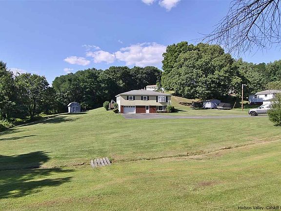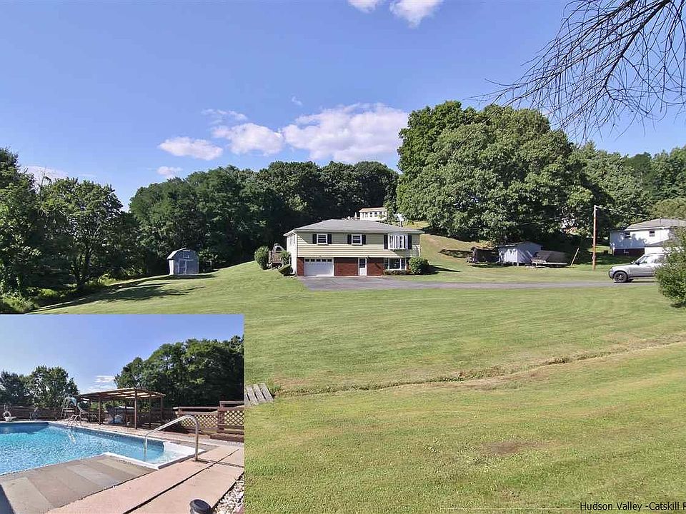 Regally sited and recently renovated, this two story home is move-in ready, offers an expansive manicured yard, private back deck and a heated in-ground pool. Homes main living level is ranch style with all refinished Oak hard-wood floors. The L shaped living/dining room is great for entertaining, dining area walks out to the back deck and pool area. There are three nicely sized bedrooms and a full updated bath on this floor. Step down to the first level of the home, there is a den, office area and another full bath with washer & dryer. Home has been well maintained and cared for through the years, replacement windows and roof are in very good condition, updated 200 amp electric, new pool liner and salt water system installed in 2014. There is a wood burning stove on each floor to keep the heating bills down, home is very efficient with low maintenance electric heat. The grounds are park like, there are three outbuildings, two sheds and a barn. Beautiful sunsets off the back deck, and distant mountain views complete the package.. Motivated seller present offers!