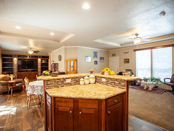 Open floor plan, 4 bed and 2 bath on almost a half acre. 2 car detached garage and storage container included. This home was setup brand new 2 years ago and has only one occupant. no pets or smoking. Very clean! Nice primary suite with a soaking tub and stand alone shower. Kitchen is beautiful with eat at bar island. ceilings are 9+ foot tall.