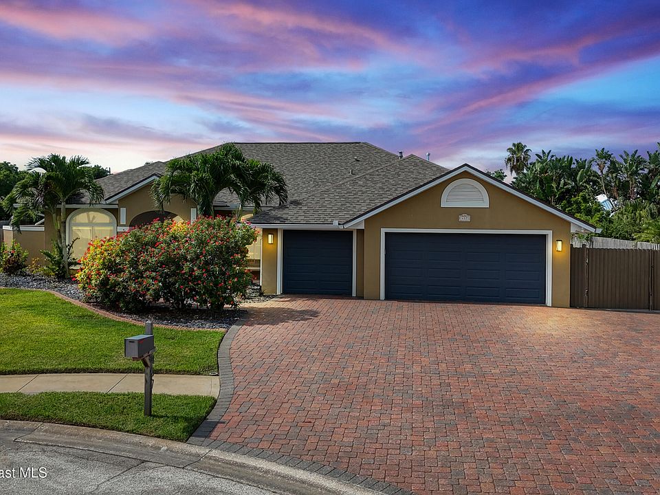 Welcome to this completely updated and meticulously maintained pool home, perfectly situated at the end of a quiet cul-de-sac in the sought-after Rio Villa community. From the moment you arrive, you'll appreciate the extra-wide paver driveway leading to a spacious 3-car garage, with additional gated space to accommodate your boat or RV on the oversized fenced side yard.