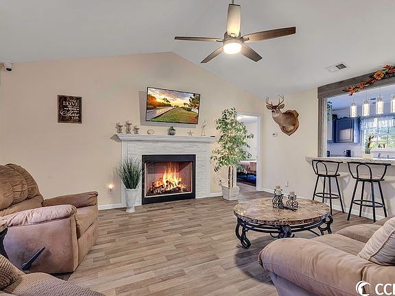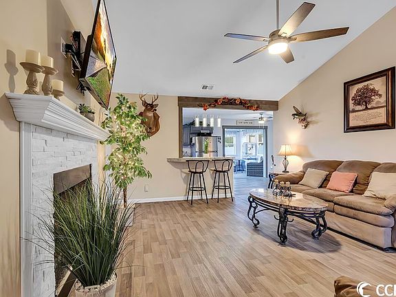 This Gorgeous fully remodeled home with 3 Bedrooms, 2 full baths, located under 8 miles to the ocean in the desired NO-HOA Perry Place Neighborhood! The home gives a very open welcome from the moment you walk through the front door with the open floor plan, vaulted ceilings, and great size kitchen! This floor plan allows for great entertainment space and complete privacy between master and guest bedrooms. Homeowners can also sit back and relax in the larges carolina room overlooking the extended fenced in back yard including the outdoor covered porch. The backyard extends past the fence line down to the lake and floating dock to relax, boat, or fish! Upgrades include - New vinyl siding, flooring, sunroom with glass sliding doors, concrete patio, buried drainage, fireplace, showers, fridge, carport, and more! The home is located minutes away from the schools, shopping ,grocery stores, dining, golf courses, Intracoastal waterway, and more!