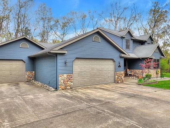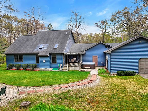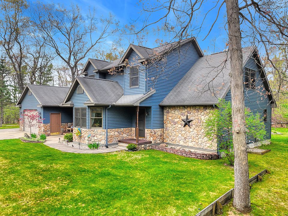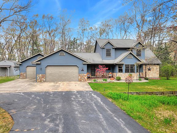 This well-maintained custom-built home is nestled on just under 4 acres in the highly sought-after Wooden Key neighborhood. Boasting 4 bedrooms and 4 full baths, it offers plenty of space for comfortable living. Inside, you'll find beautiful hardwood floors throughout the main floor, along with a spacious master suite featuring a large walk-in closet and master bath. Upstairs, there are two more generously sized bedrooms and another full bath. The basement has a cozy feel with knotty pine walls, offering additional living space including another bedroom with an egress window and a full bath. There's also a built-in sauna for relaxation. With two attached garages, each measuring 23' wide by 29' deep, there's ample room for parking and storage. Outside, enjoy the hot tub surrounded by landscaped gardens and a pathway leading to the fire pit, perfect for gatherings. Situated on a cul-de-sac with only one neighboring home, this property offers both privacy and convenience. Don't miss out on this rare opportunity to own a home in such a desirable location!