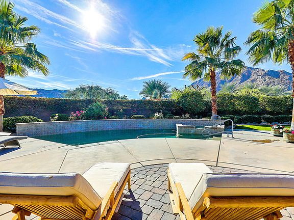 Spectacular estate home and prime location built by renowned Ministrelli within prestigious Villaggio community at Indian Wells CC. Awesome 360-degree panoramic views of mountains. Features 4 Bed, 4.5 Bath, spacious Home Office w/ gorgeous views, 3675 Sq. Ft. w/ large Guest Casita on quiet 18,731 Sq. Ft. wrap around corner lot. Views surround grand Courtyard entry, stunning Pool with cascading sheer water descents and raised Spa. Large, covered loggias, built-in BBQ Island, firepit, manicured lawns w/ abundance of citrus trees. The spacious rear loggia has a beautiful fireplace and entertainment center. Open Floor plan and travertine floors throughout w/ carpets in Bedrooms. Family Room has custom built-ins, stone fireplace, and floor to ceiling glass sliders for incredible views and best blend of indoor/outdoor living. Formal Dining Room w/ walls of glass. Gourmet Kitchen w/ Wolf appliances, granite counters, island bar seating, walk-in pantry. Luxurious Primary Suite has direct access to Pool and another spacious private Loggia for morning coffee. Primary Bath complete with large shower, jet tub, dual vanities, marble counters. Lovely Guest Casita has kitchenette with granite counters, bar refrigerator, Living Room and Bedroom w/ Bath. Home is exceptional w/ quality of craftmanship and design!
