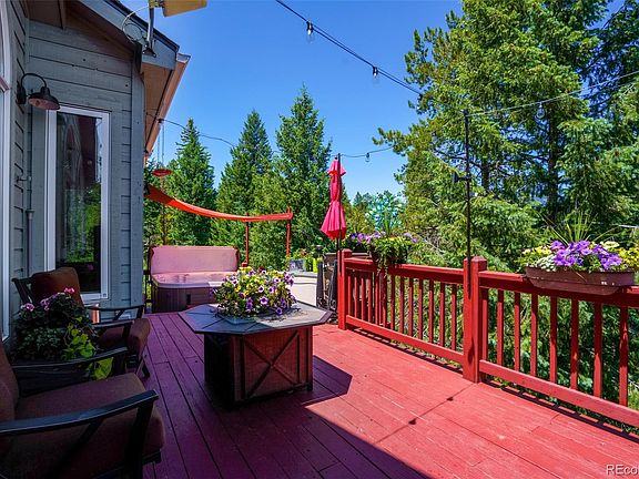 Stunning views are just the beginning of the features of this beautiful mountain home off the highly desired Upper Bear Creek Road. Updates throughout welcome you to your secluded mountain getaway with large windows that flood the home with natural light in the living, dining and Master Bedroom. The home has been updated with new exterior wood stain, new exterior and interior paint, newer granite counter tops, newer appliances and a new kitchen island. The fireplace will keep you nice and cozy as you watch the snowfall outside. The Master Bathroom is a 4 piece Master Suite with lots of counter space and separate shower and tub with remote control Hunter Douglas shades around the tub for your privacy. The lower level features the attached 2 car garage, 2 bedrooms, bathroom and one of the bedrooms has exterior access to the covered deck, fenced yard and Tuff Shed storage shed. The upper deck provides unbeatable mountain views, plenty of room for entertaining and a hot tub to spend your evenings watching the sunset. Don't wait to see this hidden gem!