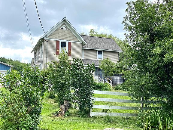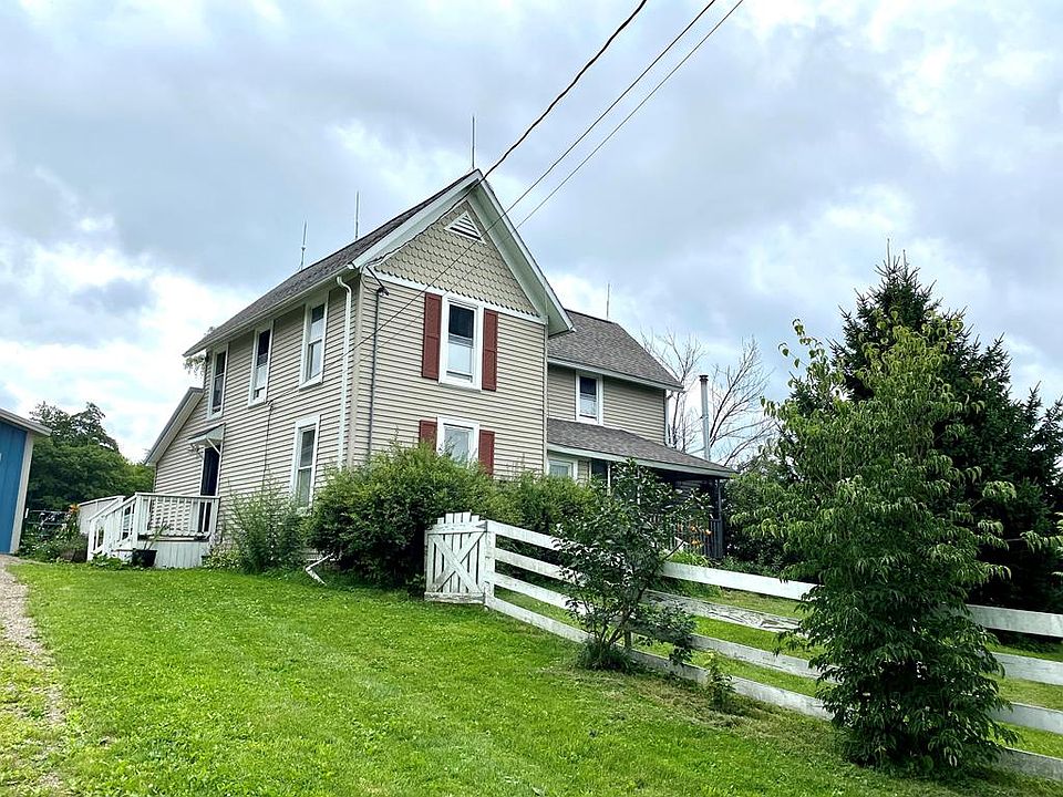1900's Rustic farmhouse nestled on 20 acres. Perfect for hunters or hobby farming. Brand new roof, newer: furnace, 2 car heated garage, electric fencing, 4 stall barn w/ tack room w/bonus finished 2nd story/loft area (rec rm, studio apt, art/hobby rm), fruit trees, garden area, even a small pond. Land is nice mix of fields and woodland. House offers hardwood floors w/ open concept, 1st floor bedrm/bath/laundry. Great views of the rolling hills. Close to Corning and Watkins Glen.