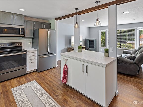 You will love this beautiful home on a quiet cul-de-sac in the heart of Mukilteo! The remodeled kitchen featuring contemporary cabinetry, stainless steel appliances, recessed lighting and luxury vinyl plank flooring is the centerpiece of an accommodating main level floorplan including a large family room and dining room off the open kitchen. 3 sizeable bedrooms up featuring a primary with dual-vanity primary bath. Lower level with huge family room and extra bedroom/office/den. Sliders out to the deck overlooking a private, fully fenced back yard and storage shed. Long driveway with plenty of parking and large, gated RV parking area as well. All appliances included!