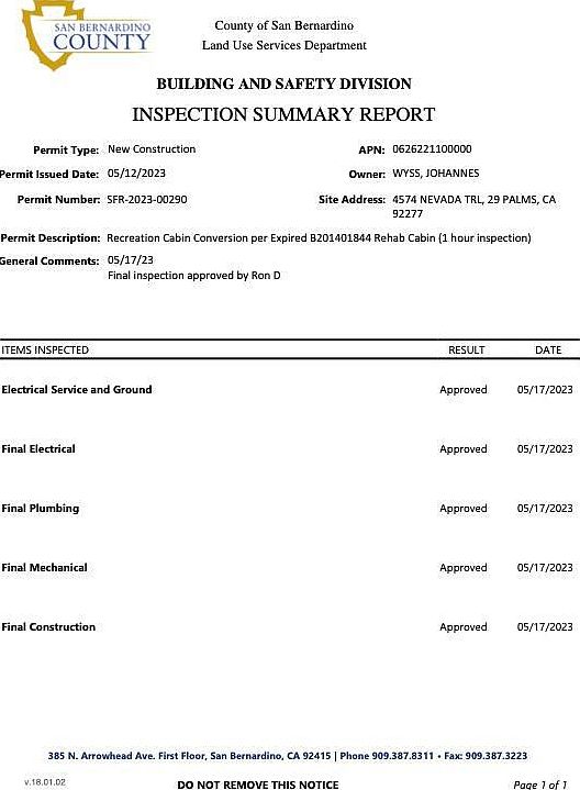 Welcome to your serene retreat in Wonder Valley! Property has been permitted as SFR by County eligible for short term renting. Property includes well water, 5 acres and views that seamlessly blends coziness with tranquility. Inside, a harmonious living and kitchen area features elegant concert floors and a kitchen with open shelving/cabinets. The bedroom area is a comfortable sanctuary, illuminated by natural light. The bathroom boasts a tastefully tiled walk-in shower and a single sink vanity. Outside, a covered front patio beckons you to unwind amidst the breathtaking surroundings. The vast 5-acre property offers seclusion and opportunities for outdoor activities, from hiking to stargazing. Embrace the Wonder Valley lifestyle in this charming cabin, where nature and comfort converge to create a timeless oasis. Don't miss the chance to make this retreat your own, a perfect blend of rustic charm and modern comfort, providing a lifetime of memories in this enchanting oasis.