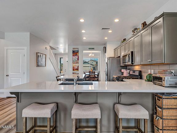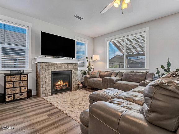 Upgrades you will love in this almost new Flagstaff Meadows home. Move in ready! Window blinds installed, landscaped and clean as a whistle. Two primary suites and the 3rd bedroom has its own bathroom as well. Upstairs/downstairs thermostat split for climate control on each level. Cozy gas fireplace in the living room. Lots of storage in the oversized garage with an 8' bump out. Possible conversion to a 3-car garage. Easy care landscaping with a fully fenced backyard on this large lot. Attractive newly constructed patio cover along with several sitting areas with pavers. Outstanding view of the San Fransisco Peaks from the patio.