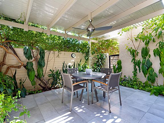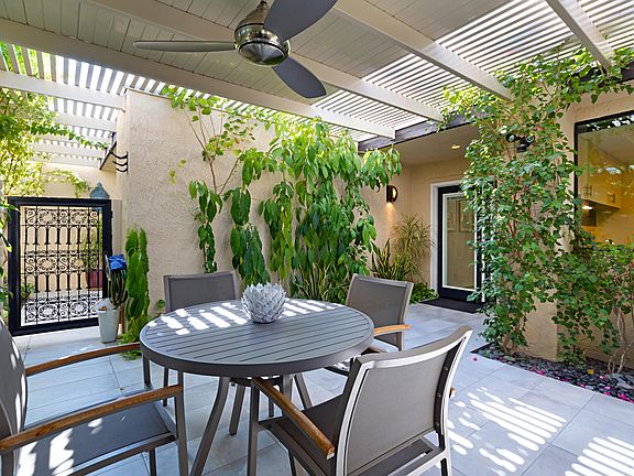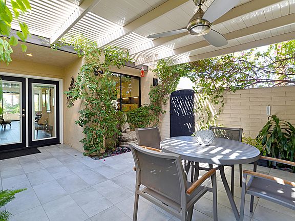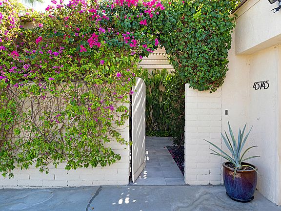 Sophisticated and stylishly upgraded 2 BR / 2 BA condo in the heart of South Palm Desert. This unit is completely remodeled and tiled throughout with fully renovated kitchen with new cabinets, stainless steel appliances, a gas stove, and beautiful quartz countertops. Combined living room and dining area features a vaulted ceiling, new dual paned sliders with a beautiful mountain view from outside patio and community pool and spa are just around corner. The master bedroom has a vaulted ceiling with a spacious feel and a large ensuite bathroom with custom tiled shower with glass enclosure. Guest bedroom has access to a small outdoor area along with a shared bath that can be locked off for a private bath. One of the highlights of the condo is the private enclosed entry courtyard that functions as a great outdoor entertaining space. This area has an alumawood covering with outdoor ceiling fan and a tranquil fountain feature that provides a calming ambiance. Condo has an attached 2-car garage with private entry into unit and all within a few minute walk to the restaurants and shopping on El Paseo and nearby hiking trails. Come enjoy the good life!