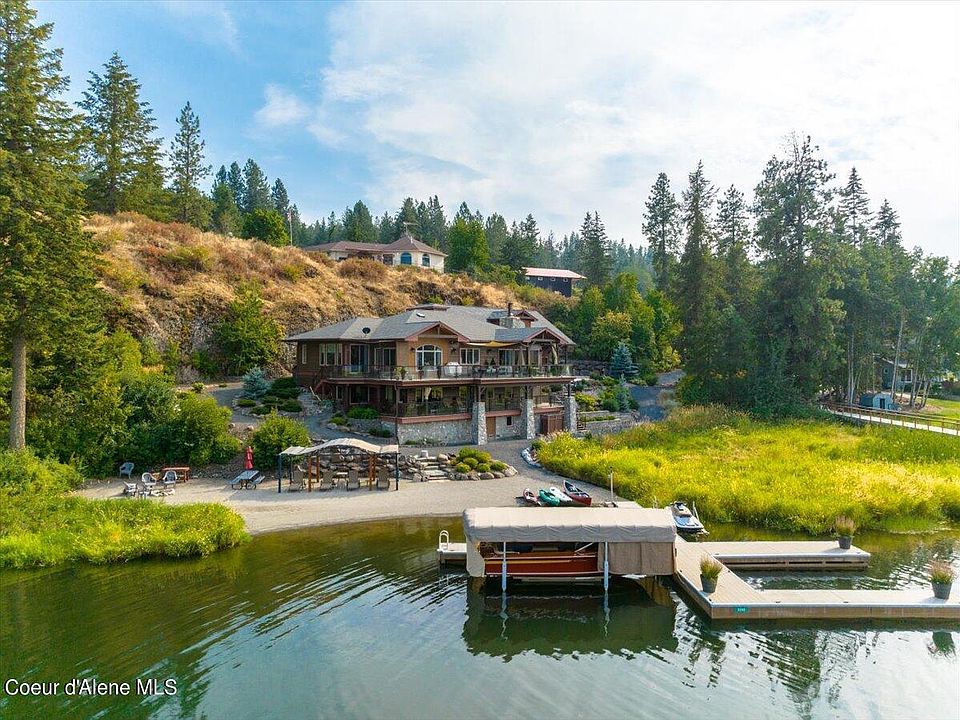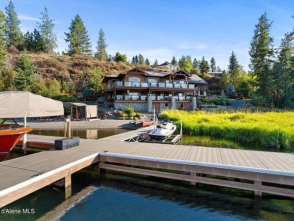 Discover paradise at this waterfront mountain retreat! Nestled on 2 acres, this 5500 sq. ft., 5-bed, 5.5-bath home boasts a covered/uncovered deck and lower covered patio. Indulge in rustic elegance with hand-scraped hickory floors, knotty alder cabinets, and kitchen granite counters. Culinary delights await with double ovens, wine fridge, island with warming oven, bar sink and walk-in pantry. Daylight basement with a second kitchen, 2 ensuites, dining and living. Cozy up by fireplaces in both the main and daylight basement. Outside, a commercial dock deck completes the waterfront paradise. With a 4-car garage, 28x50' shop, 150' sandy beach frontage, it's the perfect blend of luxury living. All this, just 5 miles from town!