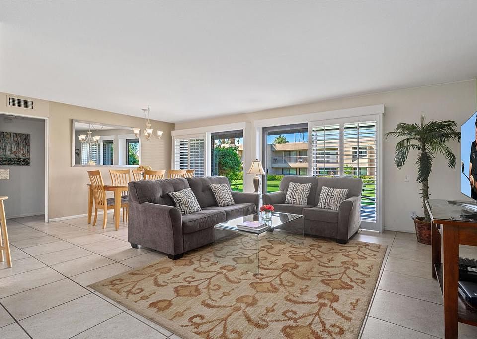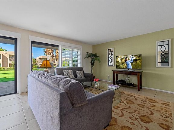 Tucked away in South Palm Desert behind the gates of the historical Shadow Mountain Resort, this beautiful 2 bedroom, 2 bath ground level unit overlooks a beautiful, lush greenbelt. Experience the perfect blend of both vacation/resort living while having the option to lease Short Term. Incredible rental potential. Granite counters in the kitchen and baths. Ideal split floor plan with kitchen opening to great room looking out to your large, covered patio. HOA covers use of the community pools and spas, water, trash, cable. Reasonable annual membership fee allows access to the tennis, pickleball and the magnificent figure 8 pool. Walk to El Paseo for a beautiful stroll and enjoy dining, shopping, and a number of art galleries.