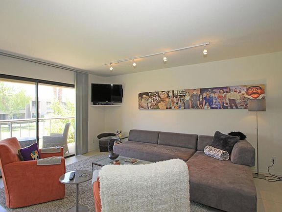 Live the resort lifestyle at this completely remodeled condo and enjoy pool, spa, tennis. Open floorplan has contemporary flare with floor to ceiling glass, white tiles, high end appliances, granite counter top. Remodeled bathrooms one with soaking tub. Large balcony overlooks pool and greenbelt. It is offered turnkey furnished except artwork. A/C replaced in 2018. It is available on short term rental either by owner or HOA program (see attached). HOA includes Pool, cable, water, trash. Tennis membership is available (see attached) . Short walk to El Paseo for shopping and restaurants. A must see!