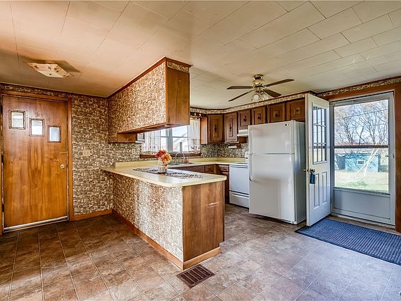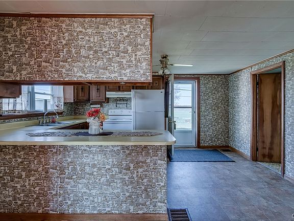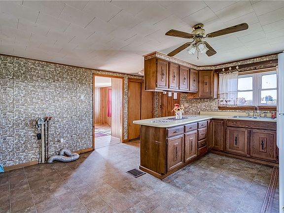 This property offers a country setting with plenty of space between neighbors. Older home with a farmhouse interior design. First floor bath, bed and laundry. Horseshoe kitchen design with breakfast bar. 3 rooms on second floor. 2 are bedrooms and one is a smaller room perfect for craft room or office. Basement houses the forced air oil furnace and tank, water heater, pressure tank and electric panel. Detached 2 stall insulated and heated garage. 2 additional storage sheds in the back yard.