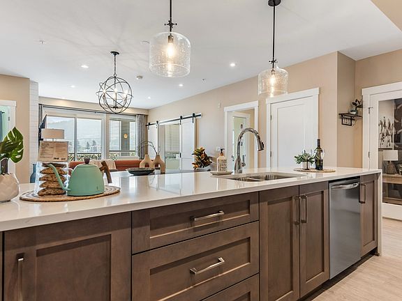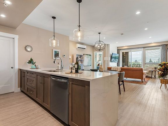Gorgeous, 2 bed, 2 bath & den bright open floorplan, mountain views + extremely quiet inside. Your carefree lifestyle awaits w/an abundance of amenities for shopping, walkable distance to Garrison & Rotary Trail for scenic walks along the Vedder River. Storage locker, pet friendly, convenient dog run, guest suite, 45+, rooftop deck w/gardens & outdoor kitchen. Enjoy 1,274 sq ft of luxury including wide plank vinyl floors throughout, custom closets, upgraded s/s appliances, A/C, induction stove, waterfall quartz countertop, laundry/storage room w/Electrolux washer/dryer, shiplap & modern barn doors. Enjoy the bright living space, primary bedroom (easily fits a king bed), full size dining room, large balcony & peacefully quiet inside the home. Make this stunning light filled home yours!