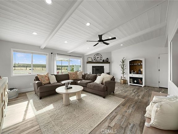 Set on a level, usable acre beside a picturesque vineyard, this updated single level ranch offers modern comfort and authentic Paso Robles charm. The approximately 1,330 sq. ft. home has undergone a comprehensive renovation over the past five years, including a new roof, HVAC, dual pane windows, flooring, lighting, and fully remodeled kitchen and baths. Quartz counters, a custom tile backsplash, and stainless steel appliances define the kitchen, while both baths showcase designer tile and custom vanities. Its living room boasts vaulted ceilings with recessed lighting, a handsome fireplace, and an oversized sliding glass door leading to the patio. The primary bedroom is appointed with a walk in closet, an ensuite bath, and secondary access to the back patio. Exterior upgrades include rain gutters, new concrete hardscape, partial oil pipe fencing, and refreshed front and backyard landscaping. With ample space for livestock, gardens, or even an additional building, this property presents endless possibilities. Enjoy the vineyard views offered by this exceptional Paso Robles ranchette!