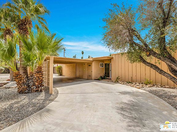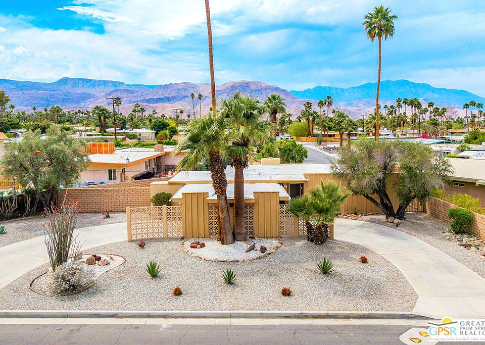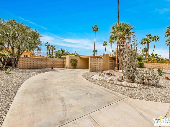 Charming Mid Century home in South Palm Desert. This 2 bed, 2 bath home has just been freshly painted throughout and re-landscaped. There is an amazing breeze block wall in front of the carport; part of the oversized curved driveway. The property has great curb appeal. The living space has a nice sized great room with gas fireplace, dining area, kitchen and walls of glass to the rear patio space. The bedrooms have ample closet space, the primary is ensuite. There are actually two patios, one off the great room and the second off one of the bedrooms; all looking to the west for great sunsets and mountains views. Both patios are semi-covered for partial shade. The large backyard is enclosed for privacy with block walls, and also has an additional open patio space for dining under the stars. This home is in a great location; near amenities, close to El Paseo for great dining and shopping options and close to the the highly regarded Washington Charter School. This will not last long!