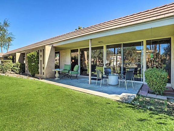 Fabulous views and ambiance 2280 Sq. Ft., 3 spacious Bedrooms with walk in closets and 3 ensuite Baths furnished Condo in the heart of Indian Wells CC! Built in 1968, this unique midcentury design by renowned architect William Krisel makes this Condo and community very special. The covered extended west back patio showcases the wide-open green lawn with west Mountain Views and large community pool surrounded by palm trees and endogenous trees. Such tranquil privacy reaches back to quintessential Palm Springs desert living at its finest! Double door entry to foyer with high ceilings and beautiful Living Room and awesome west Views. Neutral colors and tiled floors with brand new carpets in Living and Dining Room and 3 Bedrooms. Open floorplan, light and bright Kitchen with Stainless appliances and Formal Dining area boast great views. Primary Bedroom has generous Bath with dual sinks and sliders which lead out to private large central atrium for rest and relaxation. Guest Bedrooms feature large vanities and shower. The laundry room includes washer/dryer and bult-in cabinets. A newer roof and 2 car garage are also featured. Come and enjoy!