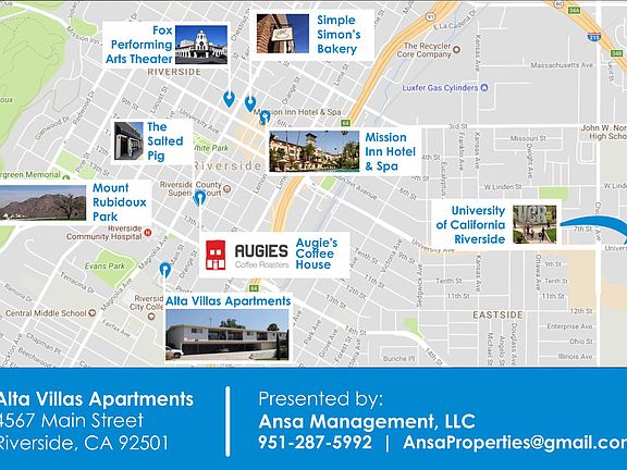 Spacious 2 BR Apartment, A+ Layout & Location, Amazing Views! Compare the view, to the new apartments (they are beautiful, but the price...!) in downtown Riverside that run about $3300 for a 2 BR.... Equivalent view, for about 2 Bedroom home has one shared wall, and is walkable to downtown Riverside, yet still just far away enough to feel quiet and secluded. Great spacious feeling layout in a small apartment community that is affordable, but located in the desirable Prospect Historic District . Your home has lots of natural lighting through each window that gives a nice, tranquil feeling. Apartment Summary: 2 Spacious Bedrooms with lots of storage Full Bath with tiled shower/tub and counter. Includes Refrigerator, Gas Stove, and Dishwasher - All Brand Names! High Speed Internet Access available up to 100 MBPS with Cable (Spectrum, formerly Time Warner). Lots of storage. LED Lighting that saves energy and gives a nice, warm light feeling. Recessed Lighting Apartment Complex Features: Beautiful views of Mt. Rubidoux (incredible sunsets) and the Calvary Presbyterian Church from the balcony! Walking Distance to downtown and the Mission Inn. Low street traffic, no out let, street cul-de-sac No Smoking Policy on the complex property. Quick access to the 91 Freeway off 14th Located in the desirable Prospect Historic District, a 3 street historical district. Lots of trees, including Palm Trees for a truly California Style. Cool breezes off the Santa Ana river bottom in summer Complex only has 14 units, and is a mixture of a studio, 1 BR, 2 BR, and a house, with a laundry room onsite, and car port. The previous owners did an amazing job of decorating and remodeling each unit, giving each apartment a boutique apartment with its own style with a touch of retro, but with modern appliances and decor. Freshly Painted, upgraded Door Levers, and Light Switches About 15 minute walk to the Riverside Downtown Metrolink Rail Station Bicycling Distance to UCR Responsive property management Call Lillian to schedule your personal tour today! 951-888-9217 Application Process: Fast - Usually only takes a day after you turn in an application and the fee. Process - A thorough background, criminal records, court records, credit, rental history (we call your previous landlords), verify employment and income, and eviction check / review is done on all adult applicants. If there are issues, please just let us know, and may be able to work with you, depending on the issue. Review - A holistic, fair review is used for qualifying tenants. Deposit - A deposit is needed to put to hold an apartment, and if you don't pass the review process that usually is done within 1 day, your deposit will be refunded. Due to higher demand, if you don't put down a deposit other people may get the apartment first - this has happened, and to be fair to everyone, we have a first come first serve policy. Application Fee - The $35 application fee for credit and background check per adult is not refundable Occupants - 5 People maximum, including kids, per CA State Recommendations. Call Lillian to schedule your personal tour today! 951-888-9217 Rent Payment / Details: Rent Amount: $1450 / month. Deposit: $995 - $500 Off with Good Credit. Lease Duration: 6 Months Pets Policy: No Pets Allowed Deposit Policy: We have a record of returning all or most of the deposits to people who move. Just leave the unit in as good shape as your received it, and you will probably be fine. Rent Payment is made on the 1st, at a local bank a few blocks away from the apartments via Cash, check, online, or via Cashiers Check. Feedback from our tenants has been very positive. Call Lillian to schedule your personal tour today! 951-888-9217 Disclaimers: Section 8 - The apartment does not participate in the Section 8 program. Equal Housing Opportunity - This community does not discriminate on the basis of race, color, religion, national origin, sex, disability or familial status. Individual apartments may have slight differences from the description and photos in this post. The information contained herein has been obtained through sources deemed reliable by Ansa Properties, but cannot be guaranteed for its accuracy. All measurements are approximate. Advertised pricing and availability are subject to change without notice and cannot be guaranteed. Call Lillian to schedule your personal tour today! 951-888-9217 Owner pays Water and Trash