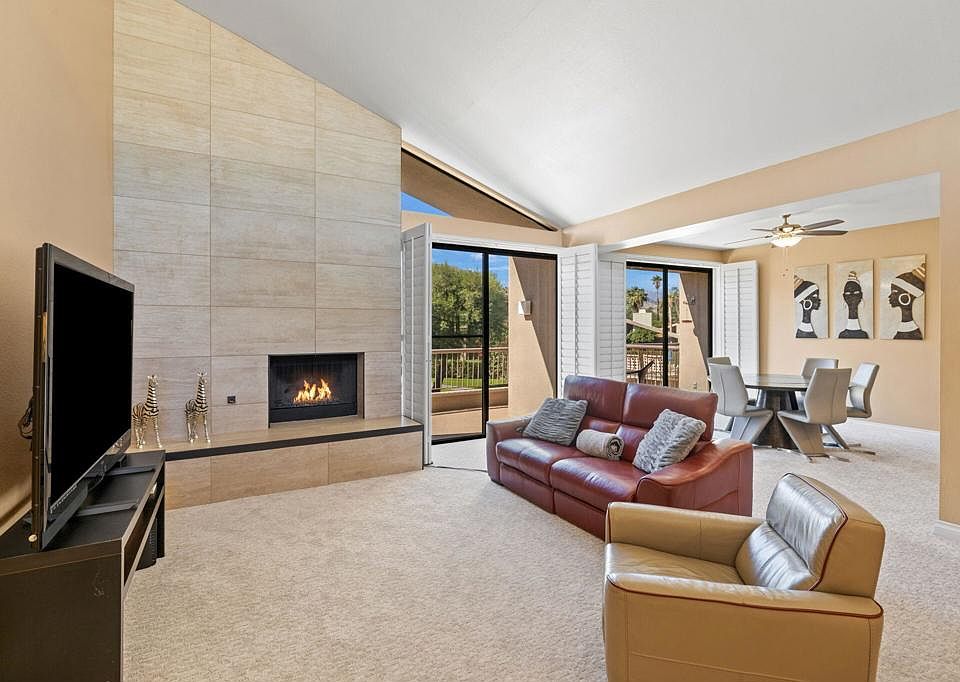 This beautiful upper villa property is located in the highly sought after Shadow Mountain Resort. Enjoy stunning mountain views from the balcony. You'll be within walking distance of El Paseo, a popular shopping and dining district. This property is suitable for SHORT-TERM rentals, making it a great investment opportunity. Upgrades include a refreshed kitchen featuring white quartz countertops, a newer HVAC system and a gorgeous floor-to-ceiling tiled fireplace with a hearth, adding charm and warmth to the living room space. This villa also comes with a one-car garage for your convenience. The Shadow Mountain Resort is a historic and renowned establishment in Palm Desert, with a legacy dating back to 1946. The resort offers a unique experience with its famous Figure 8 Pool & Spa, private villas, and elite tennis facilities. It has played a significant role in establishing Palm Desert as a top destination for year-round tennis, world-class golf, and tranquil relaxation. With over 75 years of experience, the resort is known for creating memorable vacations in Palm Desert. Don't miss this one.