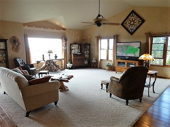 Beautiful serene location just minutes from town with a million dollar view over looking the picturesque Missouri River. You will fall in love with this exquisite 5 bdrm, 3 bath custom home from the moment you walk in the front door! The 2975 sq. ft. main floor boasts cathedral ceilings with an eye catching large rustic timber beam accent. The inviting open floor plan includes an array of large Anderson windows that accentuate the breath taking view! A Gourmet kitchen is truly a chef's delight with an abundance of custom built cabinetry in a rich glazed finish, several pull-out drawers, top of the line appliances with a 4 burner gas range with griddle, stainless steel hood, beautiful granite counter tops, under mount sink, center island, unique accent lighting, and real hardwood flooring! The massive master suite includes a seating area, gas fireplace, walk in closet, large custom bath with tile walk in shower, soaking tub, double sink vanity and more of those large windows to remind you of your unparalleled view! Additionally, there is a 2nd bdrm on the main floor, unique farmhouse style bathroom with shower and claw foot tub, large dining room, mud room, a lot of great closet space and a laundry room. The lower level was finished in the spring of 2018 adding 2600 finished sq. ft! The lower level includes: 3 additional bedrooms, a 3/4 bath, large family room, office, game room/craft room and large bonus room. This home was built by Todd and Jerry Hopfauf with every aspect demonstrating high quality custom finishes and impeccable craftsmanship! HUGE 1448 sq ft. 3 stall heated garage with hot/cold water, floor drain and additional space for a work shop or man cave. The yard has been professionally landscaped and includes a 400 sq ft maintenance free deck and a patio for you to enjoy the the morning sounds of meadowlarks and peaceful starry nights! This magnificent home sits on 1.79 acres with room to build a shop! Main floor is wheel chair friendly!