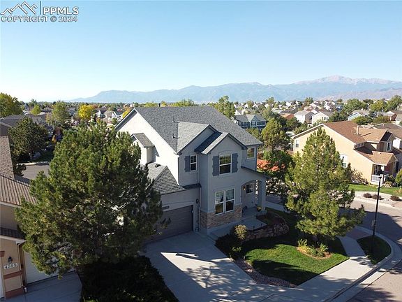 Jackpot! Welcome to this gorgeous 4-bed/4-bath two-story home in D20 with unobstructed Pikes Peak Views! Located on a corner lot in the hugely popular Briargate neighborhood of Gatehouse Village with no HOA, your next home offers convenient access to schools, shopping, hospitals and all military bases. On the main-level, you'll find an office with french doors which could also be used as a formal dining room if desired. The gleaming hardwood floors lead to a bright & airy open floor plan featuring an eat-in kitchen with an island and tons of cabinet space, and a cozy family room with a natural gas fireplace. Walkout from the living room to a newer 16x12 composite deck with stunning VIEWS of Pikes Peak and the entire front range! This is the perfect place to enjoy a quiet morning coffee or watch a majestic sunset over Pikes Peak. Upstairs you'll find three bedrooms including a large owners suite complete with a dual-sided fireplace and sitting room. Don't leave without checking out the mountain views from the second level! The lower-level has a fully furnished wet bar with a full-sized fridge and dishwasher. There's also a large bedroom and family room which walks out to the fully fenced private back yard. Keep cool in the summer with Central Air, and stay organized with the 3-car tandem garage with loads of built-in storage racks. This home has tons of recent upgrades including: new roof, gutters & downspouts; new garage door & opener; fresh exterior paint; newer composite deck; and new lower-level patio door. Don't wait -- come see everything this home has to offer TODAY.