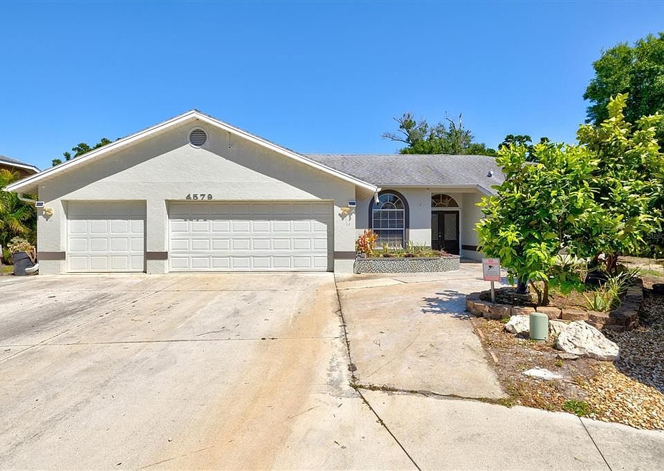 One or more photo(s) has been virtually staged. Welcome to your home in the prestigious Emerald Gardens subdivision! This home features 4 bedrooms and 3 bathrooms, offering ample space for comfortable living and entertaining. The high ceilings and skylights throughout the home flood the interior with natural light, creating a warm and inviting atmosphere. Cozy up by the beautiful stone fireplace in the living room, perfect for chilly evenings or relaxing with loved ones. A screened lanai, and large, fenced backyard surrounded by mature trees, offers privacy and the perfect space to entertain and enjoy the beautiful Florida weather. Situated on a quiet cul-de-sac, this property also offers a 3-car garage for added convenience and storage space. Fresh interior paint and landscape has recently been added to elevate the curb appeal of this home. With its desirable location, and charming features, this home makes perfect for either full-time occupancy or investment opportunity.