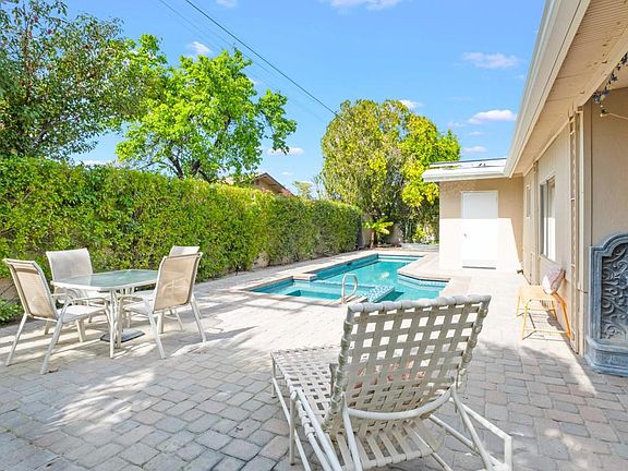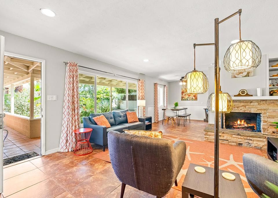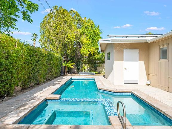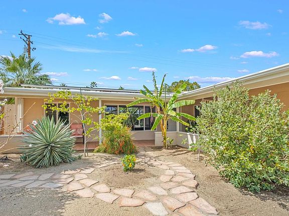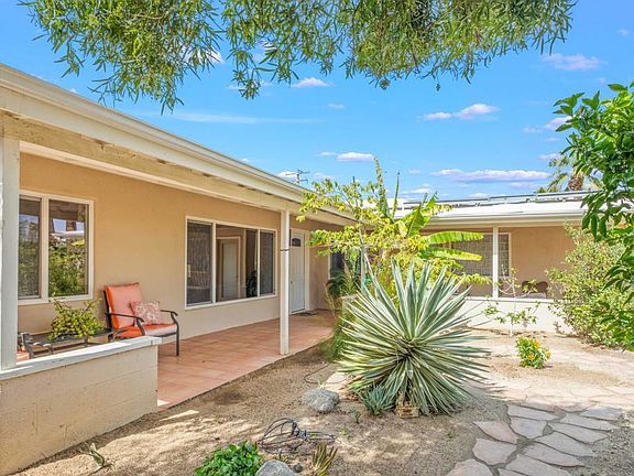 Discover the allure of Palm Desert living with this captivating mid-century residence, ideally situated near the vibrant shops and eateries of El Paseo. Boasting 2 bedrooms and 2 baths in the main dwelling, this home offers a blend of comfort and potential for creative enhancement. The primary bedroom features a spacious room, with closet as well as en-suite shower and sink for added convenience. The attached casita is currently occupied as an income producing property featuring a bathroom, closet, and shared separate laundry facilities. Entertain guests in the intimate living room, adorned with ceramic tile flooring and a striking stone corner fireplace. Flexibility abounds with additional space offering endless possibilities to expand the kitchen, living area, or convert into an additional bedroom or sunroom. Step outside into the lush backyard oasis, featuring a serene pebble tec pool and spa surrounded by mature fruit trees and an herb garden. Ample space in the front yard offers potential for expansion, allowing buyers the opportunity to customize and enlarge the footprint as desired. The home includes leased solar at $265 per month making the electric bills affordable! Embrace the quintessential Palm Desert lifestyle in this charming retreat, where every corner exudes warmth and possibility. Don't miss your chance to make this your dream desert haven. Square footage to be verified by the buyer. Schedule your showing today!