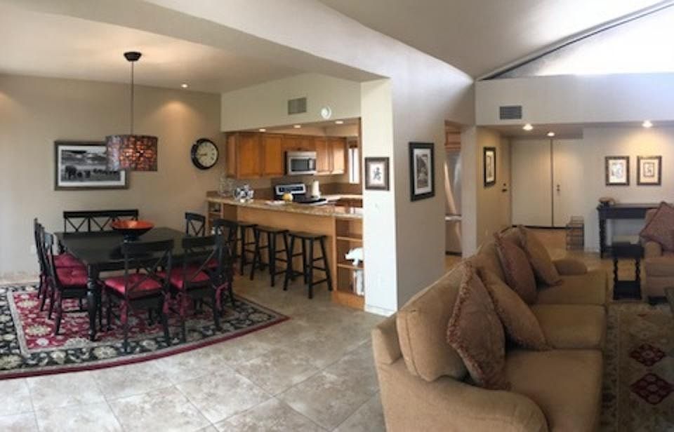 Only Villa in Shadow Mountain with an attached Casita! English Plantation style, sold turnkey and completely gutted/remodeled featuring custom cabinets, marble & granite counter tops, water purifiers in Kitchen & Wet Bar. Kitchen and Master bath ceilings were raised and the kitchen was opened to the dining & livingroom. Clerestory windows, fireplace, inside laundry area, 2 car garage with storage and private mailbox. Large private patio is steps away from one of 3 HOA spas and pools. South facing with several patios. Must see to believe! Garage door & motor were replaced in 2013. HOAs paid quarterly, with the monthly breakdown of $514.64 which includes landscape, outdoor maintenance, 3 HOA pools/spas, roof, earthquake insurance, basic cable and trash. Fully furnished Casita with private entrance & complete with a kitchenette, cabinets/storage /closet space new A/C & large bathroom. Rented solid for 7 years and more than covers the HOA dues and property tax for Unit 523!